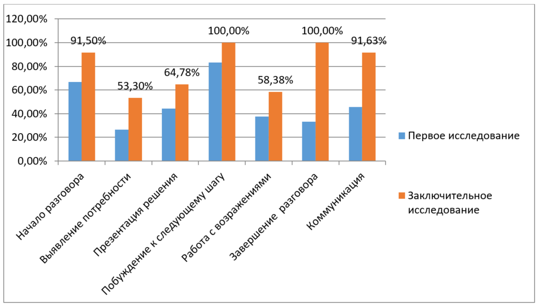 Однако следует отметить, что на данный момент в работе отдела продаж также наблюдаются недостаточные показатели эффективности в рамках «Выявления потребности клиента» и «Работы с возражениями». Это тема следующего обучения.